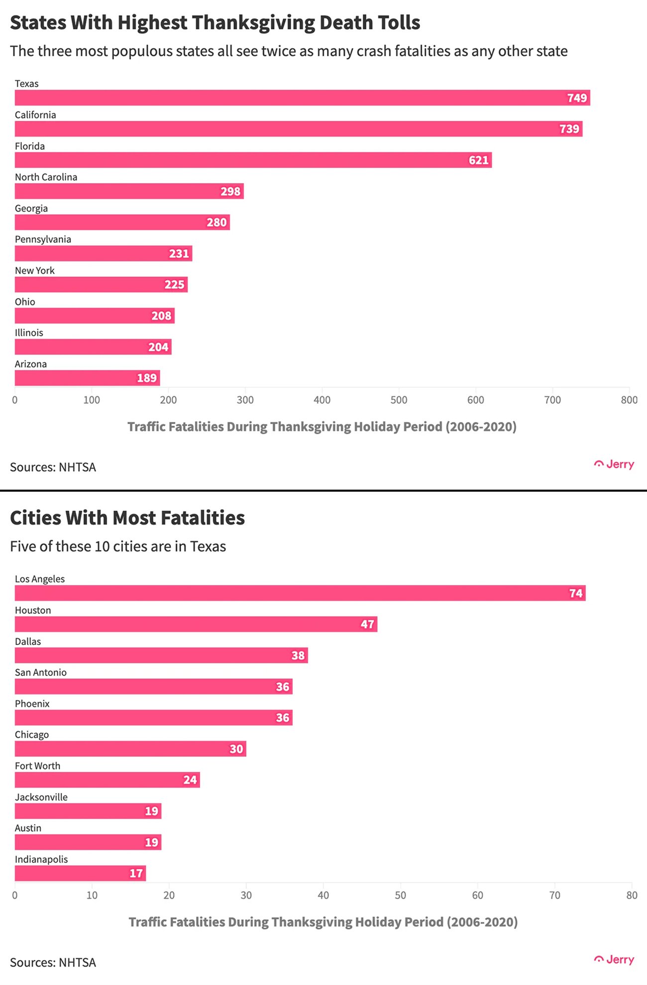 제리에 따르면 추수감사절 연휴에 발생한 교통사고로 소중한 생명을 잃은 텍사스의 희생자들은 총 749명이었다. 미국에서 인구가 가장 많은 주인 캘리포니아는 텍사스보다 10명이 더 적었다. 텍사스와 캘리포니아에 이어서 플로리다가 621명으로 교통사고 사망자가 세번째로 많았다.
