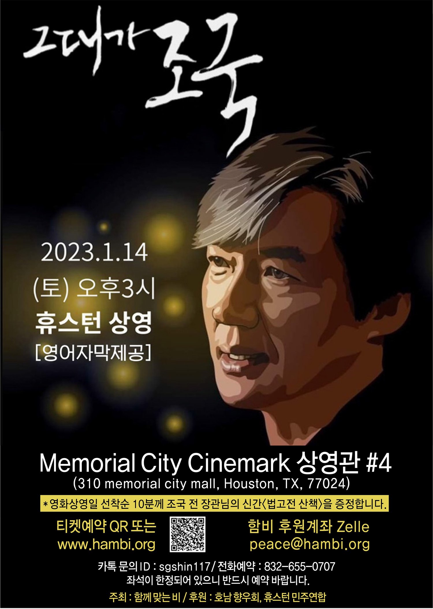 2023년 1월 14일(토) 오후3시 Memorial City Cinemark 상영관 #4 310 memorial city mall Houston, TX 77024 T:832-655-0707 www.hambi.org *좌석이 한정되어