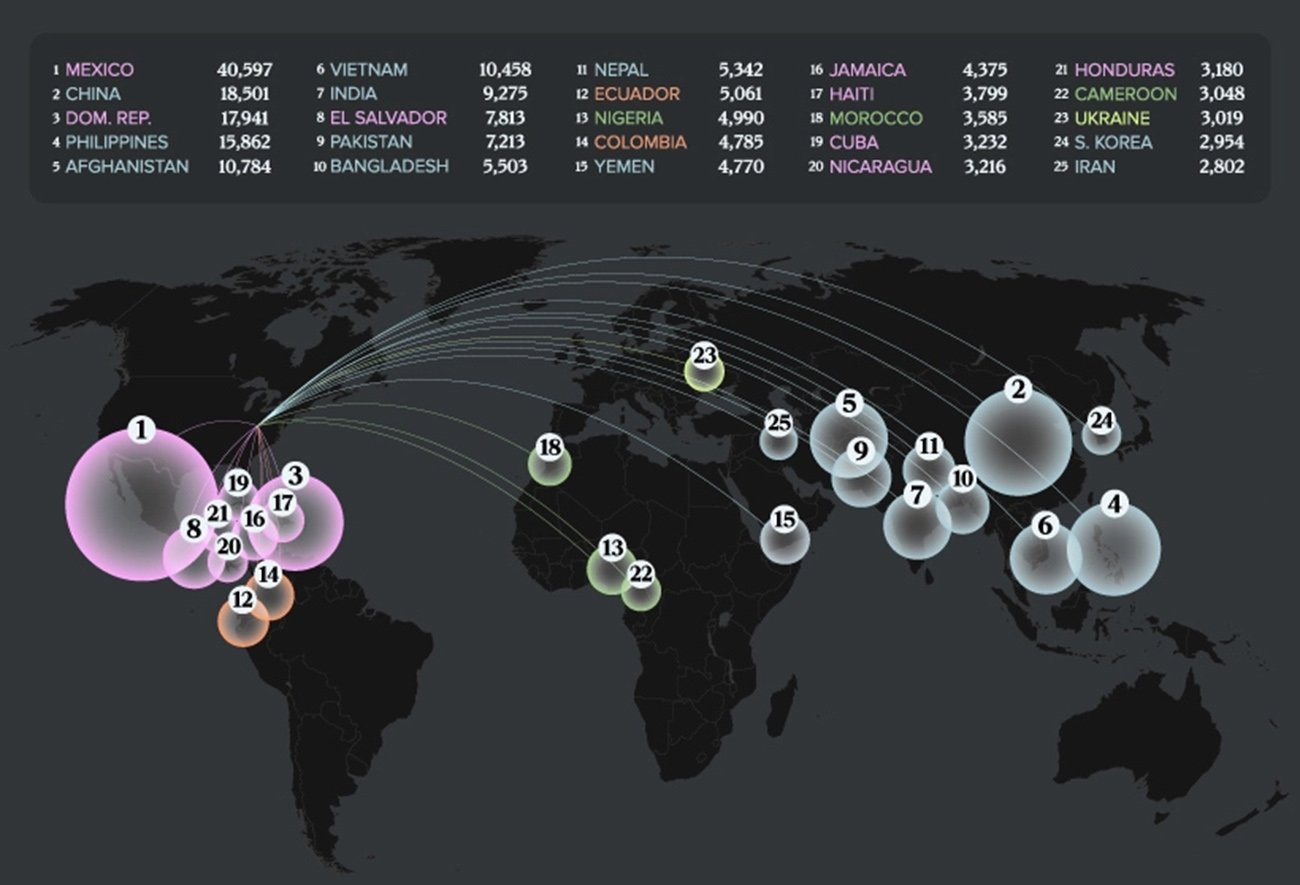 한국보다 이민비자 신청이 많은 나라는 1위 중국에 이어 필리핀 15,862명, 베트남 10,458명, 인도 9,275명, 파키스탄 7,213명, 방글라데시 5,503명, 그리고 네팔 5,342명의 순으로 나타났다.