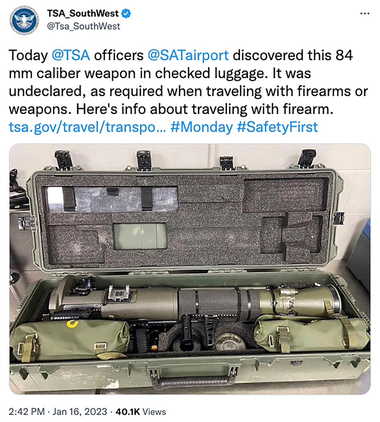 ABC, 폭스뉴스 등은 17일 TSA가 16일(월) 텍사스 샌안토니오 국제공항(SAT)에서 84mm 구경의 바주카포를 적발했다고 전했다.