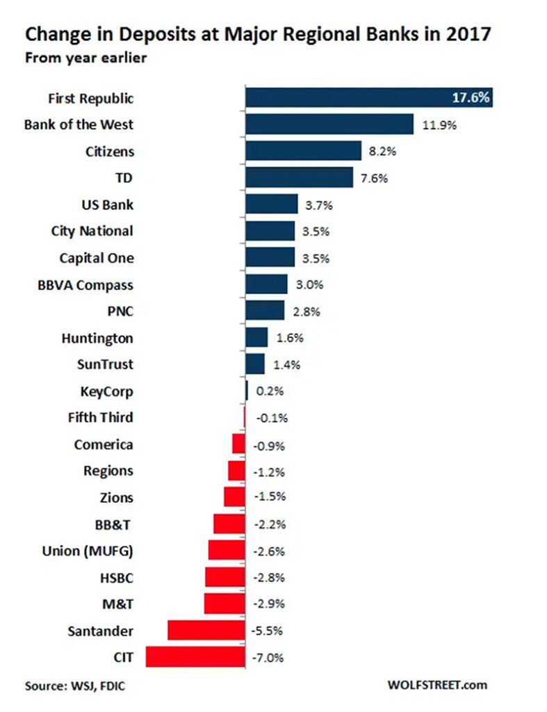 체이스, 시티, 웰스파고 등 전국에 지점망을 갖고 있는 ‘전국은행’들이 텍사스 등 일부 지역에서만 지점을 운영하는 커뮤니티뱅크 즉 ‘지방은행’들과 수신전쟁을 벌였는데, 당시 웰스파고가 예치이자율을 공격적으로 올리면서 고객들의 돈이 몰린 적이 있다.