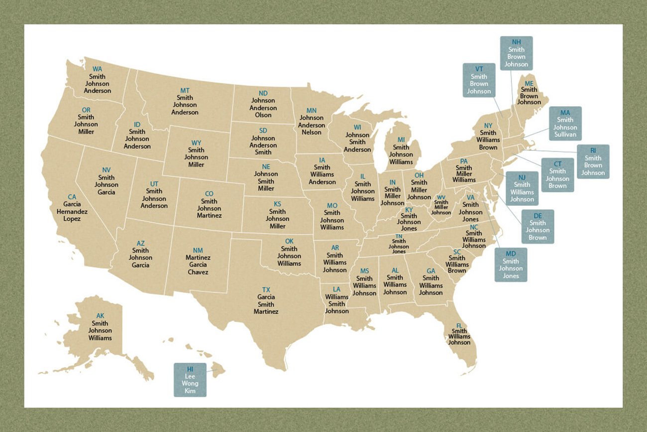 한국에 김(金), 이(李), 박(朴)이 있다면, 미국에는 스미스(Smith) 존슨(Johnson), 밀러(Miller)가 있다. 한국의 성씨별 인구 분포에 따르면 김(金), 이(李), 박(朴) 순으로 가장