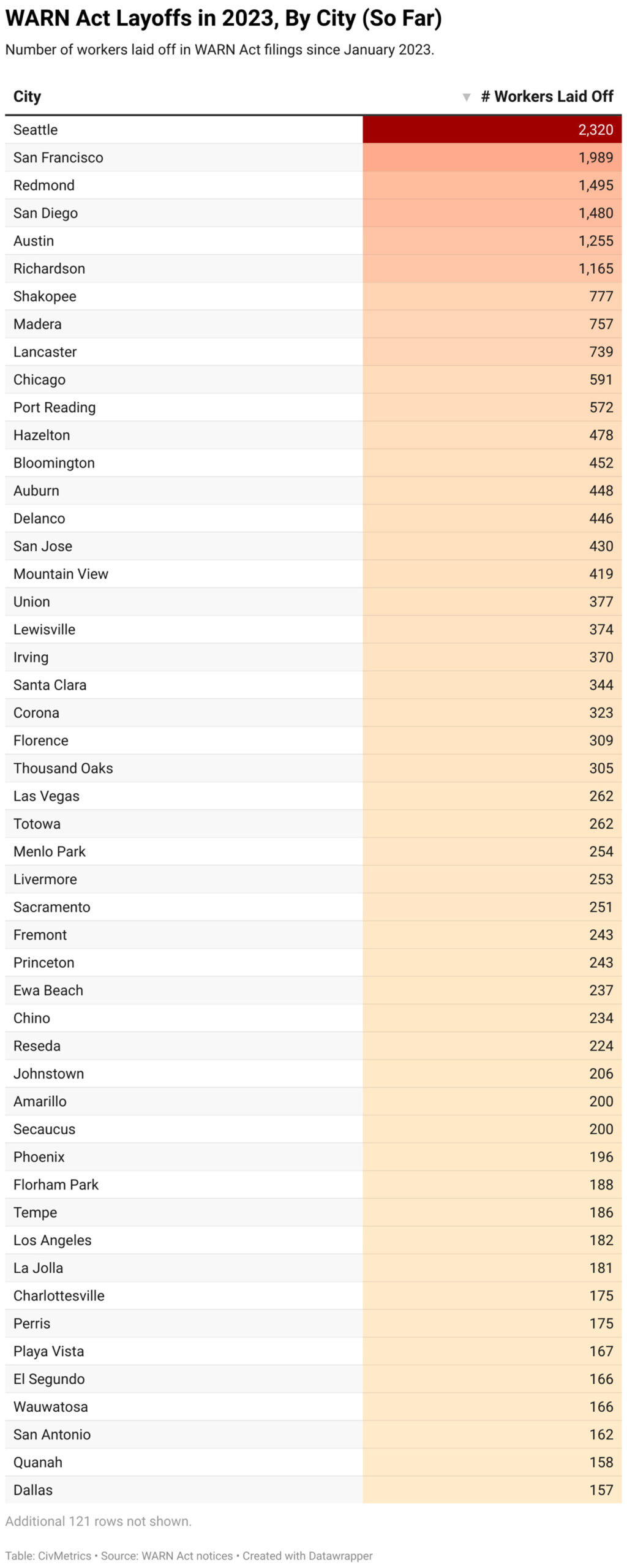 경제분석회사 시브메트릭스(CivMetrics)가 해고자를 주정부에 의무적으로 보고해야 하는 고용인원 100명 이상의 기업을 대상으로 도시별 해고자를 분석한 결과 올해 1월까지 해고자가 가장 많은 도시는 시애틀로 2,320명이 해고됐다.