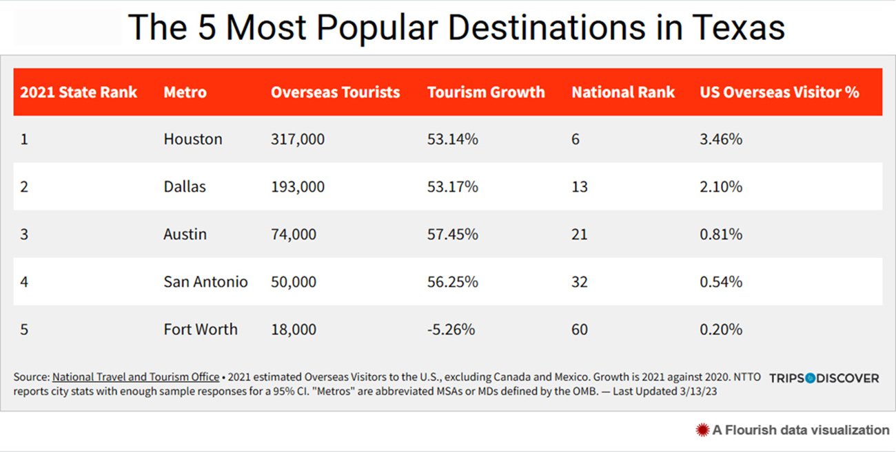국제무역청(International Trade Administration)의 국립여행 및 관광사무소(National Travel and Tourism Office·NTTO)의 통계에 따르면 외국인이 가장 많이 찾는 텍사스 도시는 휴스턴이었다.