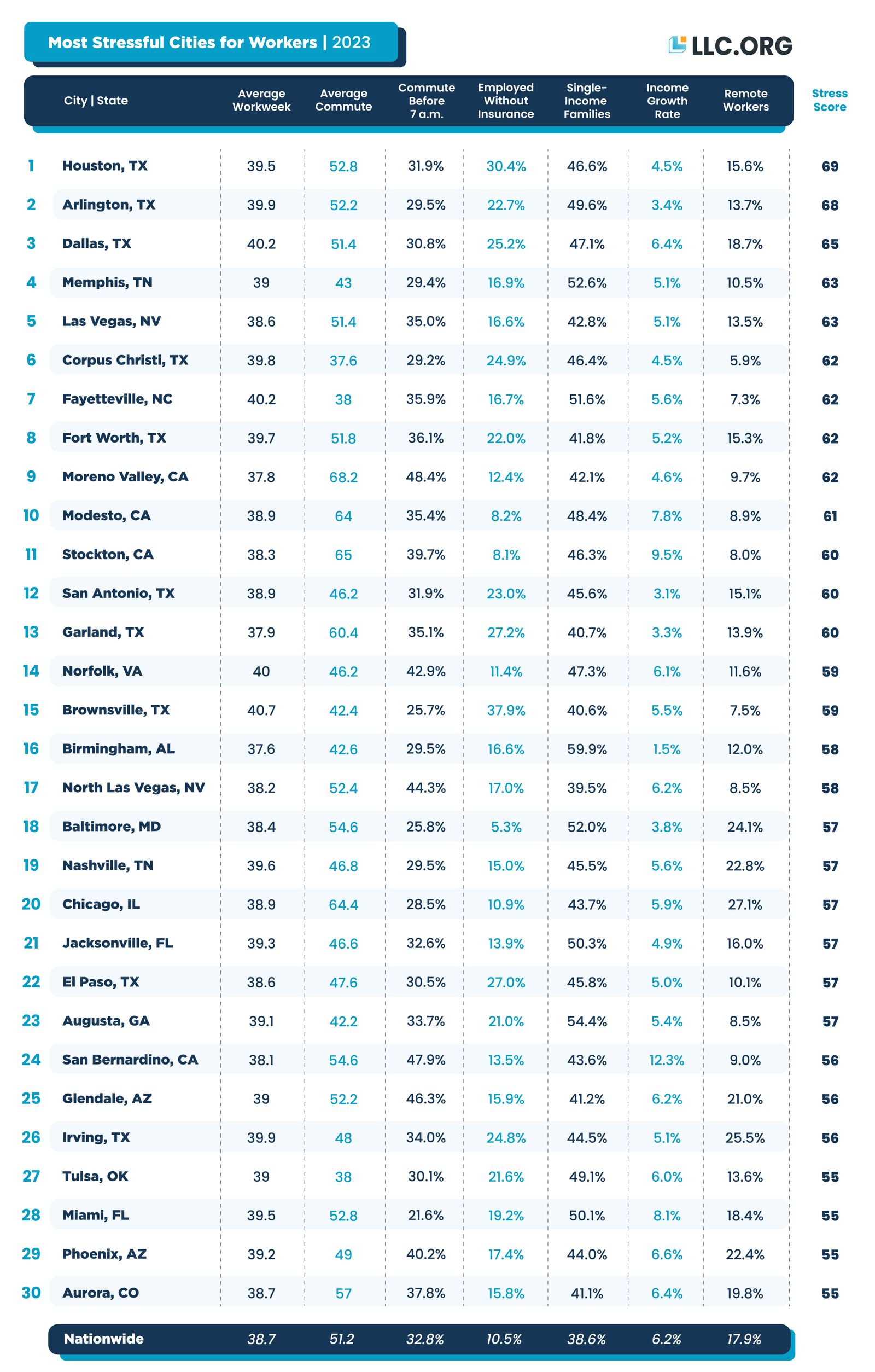 LLC는 조사대상 도시 직장인들의 근무시간(20%), 출퇴근시간(20%), 오전 7시 이전에 출근(10%), 재택근무(10%), 18세 이하 자녀가 있는 외벌이(10%), 소득증가율(10%), 의료보험이 없는 직장인(10%), 그리고 도시의 범죄율(10%)을 기준으로 직장인의 스트레스를 조사한 결과 휴스턴이 69점으로 가장 높았다고 밝혔다.