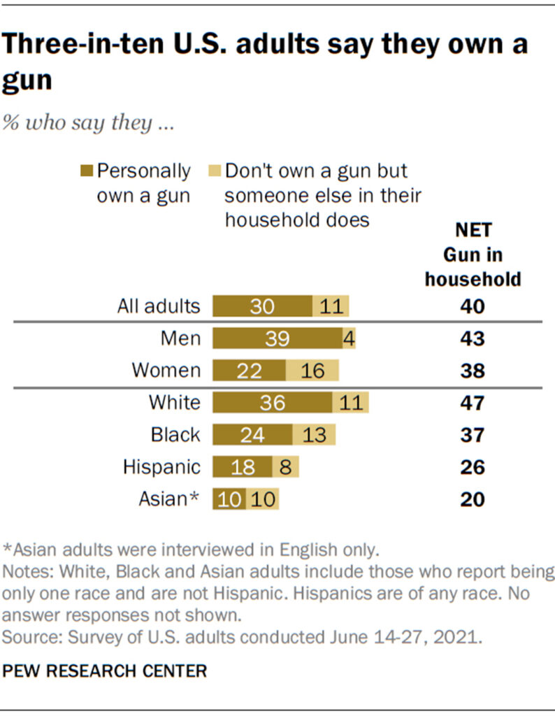 같은 조사에서 총기를 소유하고 있다고 응답한 백인은 34.3%, 흑인은 25.4%, 그리고 히스패닉은 28.3%였다.