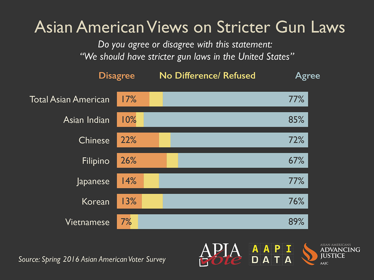 아시안단체들(APIAVote, AAJC, 그리고 AAPI Data)이 아시안 이민자들을 대상으로 2016년 공동으로 실시한 여론조사에서 응답자의 77%가 총기규제를 더 강화해야 한다고 답했다. 총기규제강화에 동의하지 않는다는 응답은 17%에 그쳤다.