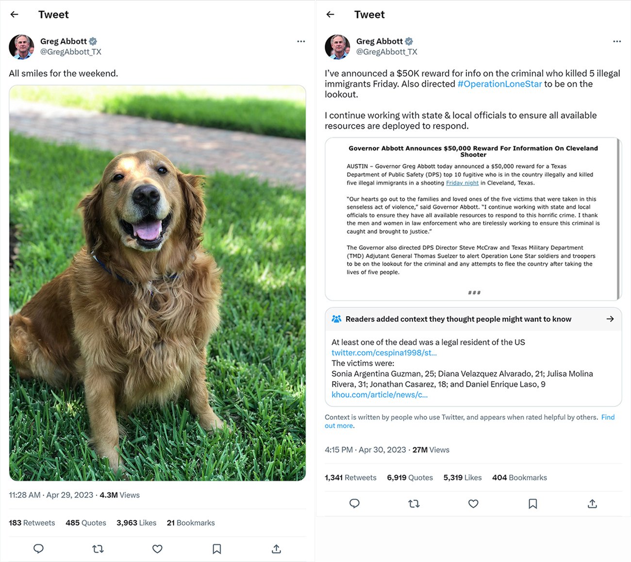 지난주 28일(금) 텍사스 클리블랜드에서 이웃집 남성이 쏜 총에 5명이 사망하는 대형 총격사건이 발생한 가운데 경찰 300여명이 도주 용의자 체포를 위한 비상사태에 돌입했다는 소식을 거의 모든 언론이 보도했지만, 애보트 주지사는 사건발생 다음날인 29일(토) 오전 11시28분 트위터에 자신의 반려견 사진과 함께 “주말동안 모두 웃으세요”(All smiles for the weekend)라는 글을 올렸다.