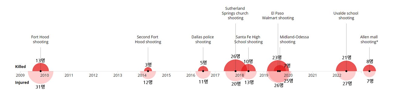텍사스트리뷴(Texas Tribune)은 8일(월) 지난 2009년부터 텍사스에서 발생한 대형총기난사를 정리해 보도했다.