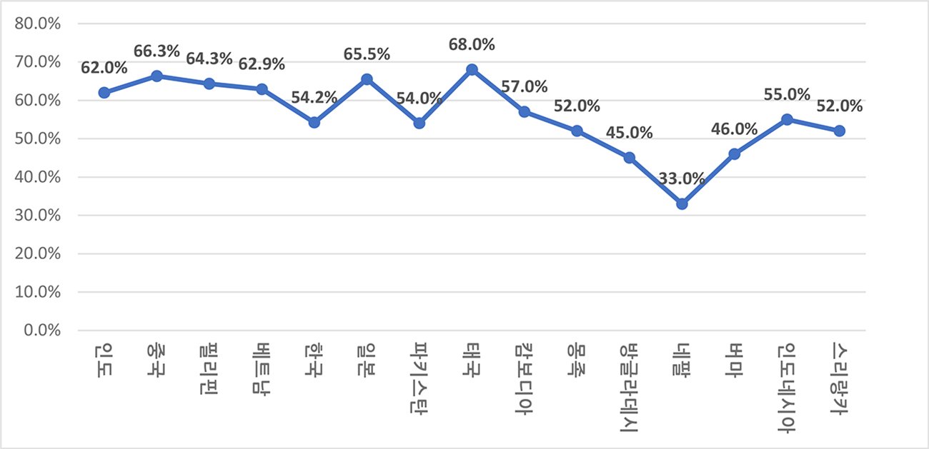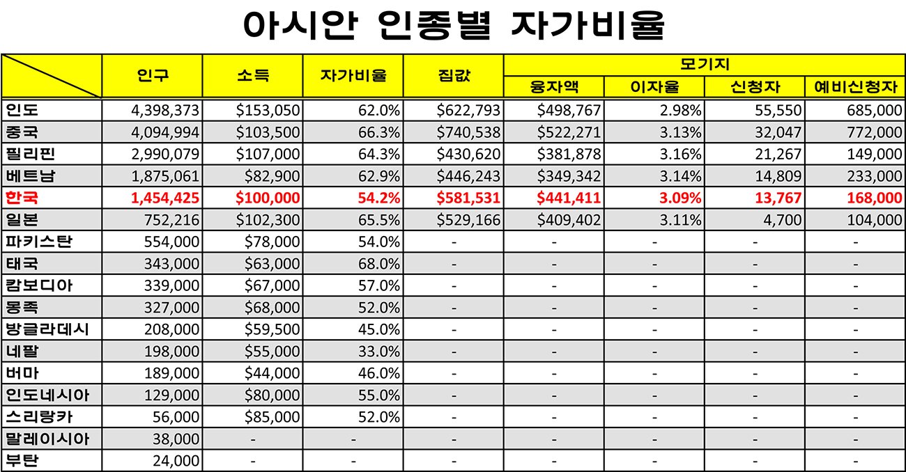 AREAA에 따르면 ‘내 집’을 갖고 있는 아시안의 비율, 즉 미국 내 아시안의 자가(自家) 비율이 가장 높은 아시아 국가 출신들 중에 한국은 조사대상 15개 국가들 가운데 9번째인 54.2%인 것으로 나타났다.