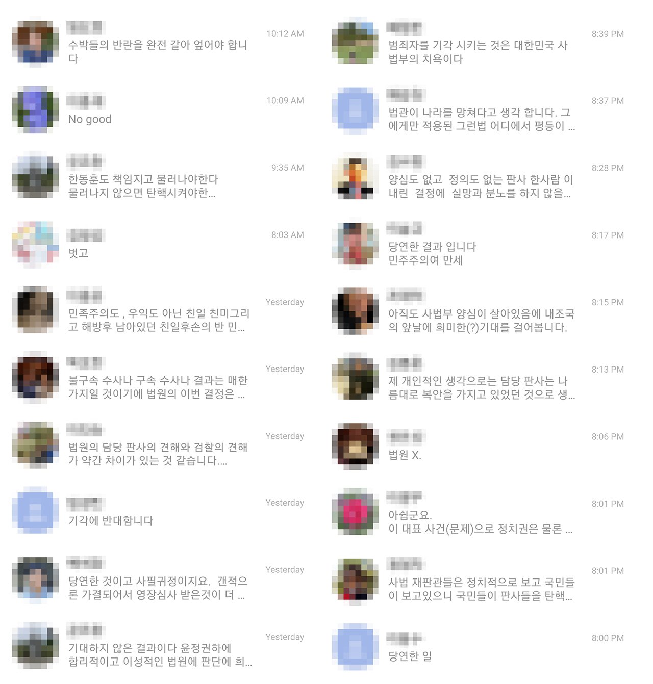 동포 B씨는 “법관이 나라를 망쳤다고 생각 합니다. 그에게만 적용된 그런 법 어디에서 평등이 있나요. 온통 국회가 정신을 그에게만 쏟아지면서 국정은 바닥에 내동댕이 쳐놓고 내년의 예산과 입법부 대정부질문은 행정부 국무위원에게 질의의 수준은 참으로 가관이네요”라는 입장을 밝혔다.