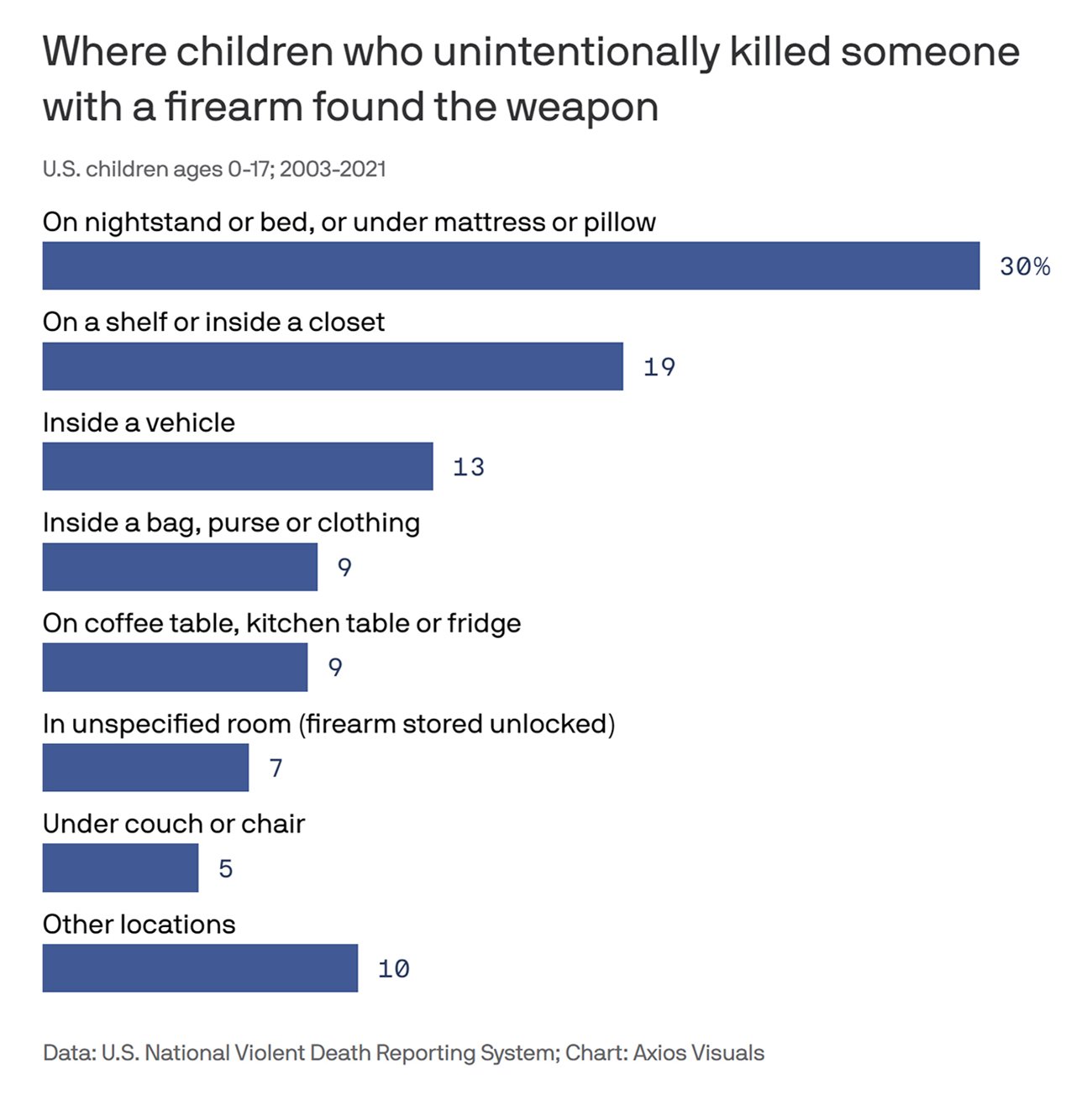 총기사고로 사망에 이른 가장 많은 아동·청소년(30%) 문제의 총기를 침실에서 발견했다. 이어서 어린이들이 집안에서 총기를 발견한 장소는 장롱이나 선반(19%), 자동차(13%), 가방이나 핸드백(9%), 식탁이나 테이블(9%), 방(7%), 그리고 소파(5%) 순으로 나나탔다.