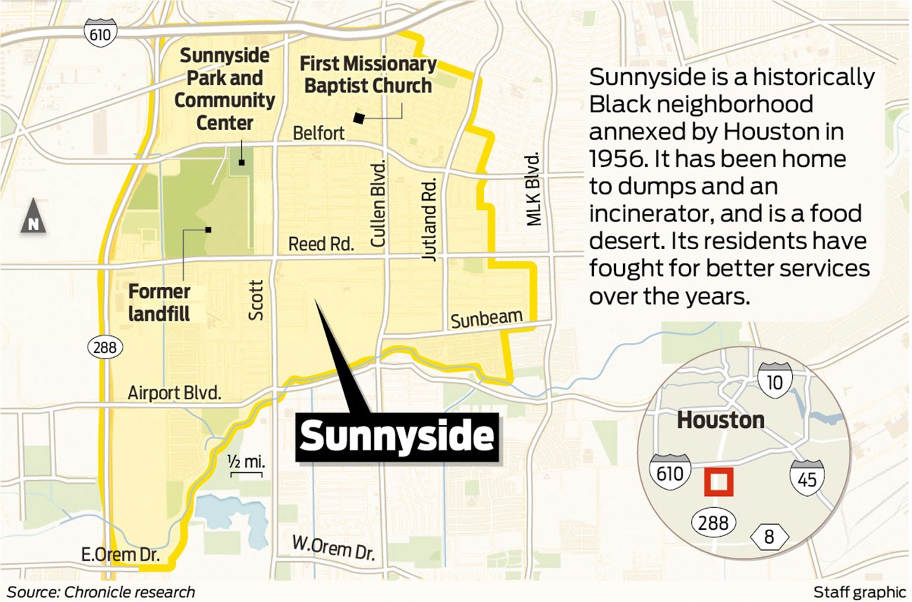 휴스턴크로니클은 610번(I-610) 순환고속도로와 288번 고속도로가 만나는 남동쪽 지역에 위치찬 써니사이드는 1956년 이후 흑인들이 다수 거주해 온 흑인 밀집지역이라고 소개했다. 휴스턴크로니클은 또 써니사이드에는 쓰레기매립장과 화장터가 있고, 그로서리스토어가 없는 ‘푸드데저트’(Food Desert) 지역으로도 알려져 있다고 밝혔다.
