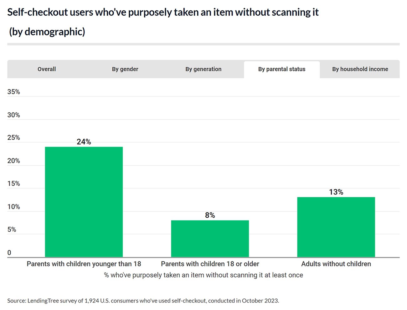 18세 이하의 자녀를 두고 있는 부모의 24%가 무인계산대에서 값을 지불하지 않은 경험이 있다고 밝혔다. 연령이 18세 이상의 자녀를 두고 있는 부모들은 8%만 값을 지불하지 않았다고 응답했다.