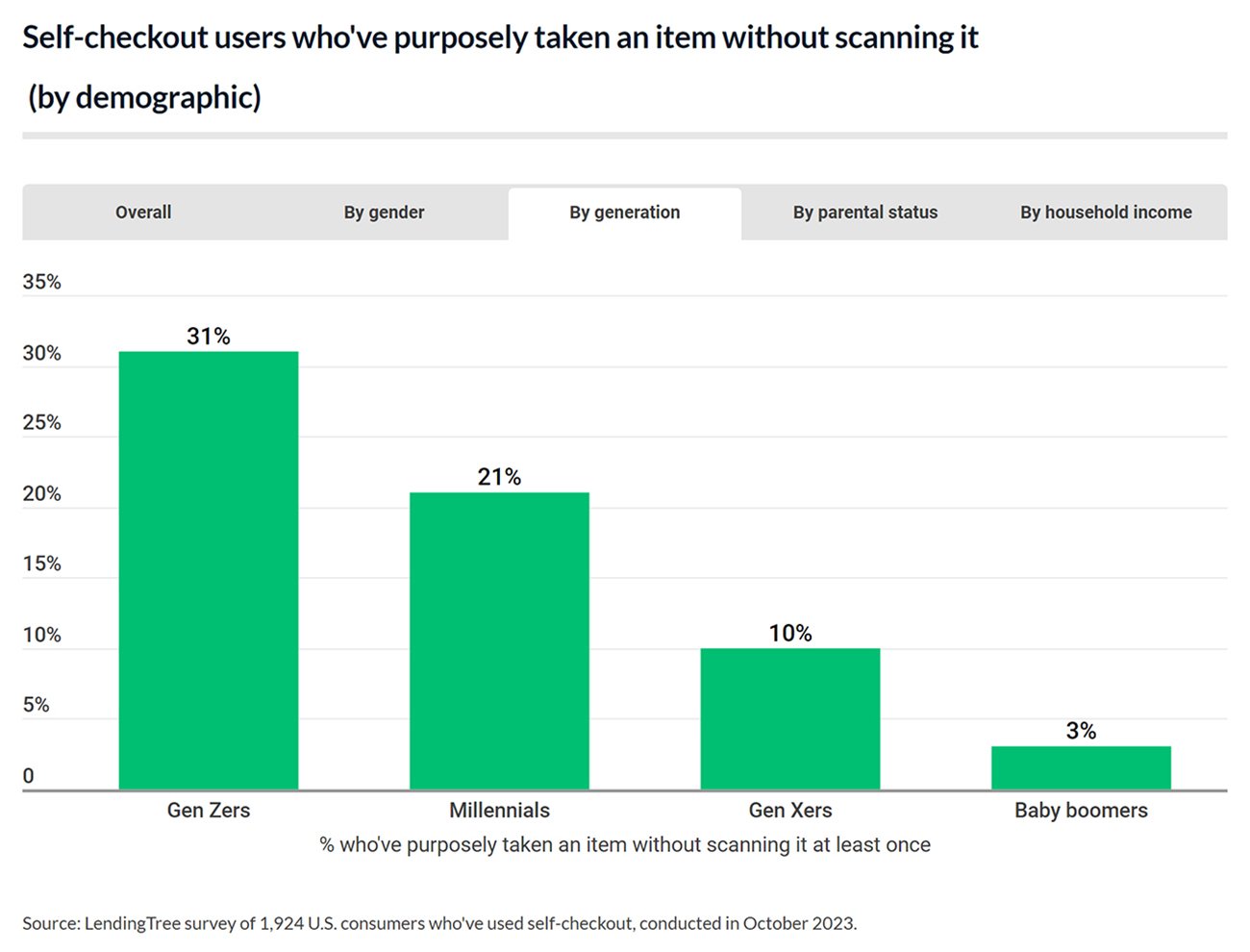 베이비부머세대(60세~69세)에서는 3%만 무인계산대에서 값을 지불하지 않은 경험이 있다고 응답했다. X세대(44세~59세)에서는 10%가, 밀레니얼세대(28세~43세)에서는 21%가 값을 지불하지 않았다고 답했는데, Z세대(12세~27세)에서는 무려 31%가 무인계산대에서 값을 지불하지 않았다고 응답했다.