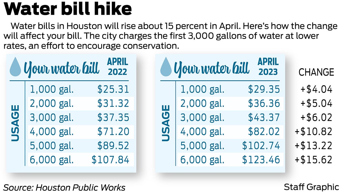 공공사업국의 요구로 매년 4월이면 수도요금이 인상되는데, 휴스턴크로니클은 2022년 3,000갤런의 수돗물을 사용한 가정이 $37.55달러의 수도요금을 냈고, 2023년에는 $6.02 오른 $43.37달러를 냈는데, 올해 4월 또 다시 오른다고 전했다.