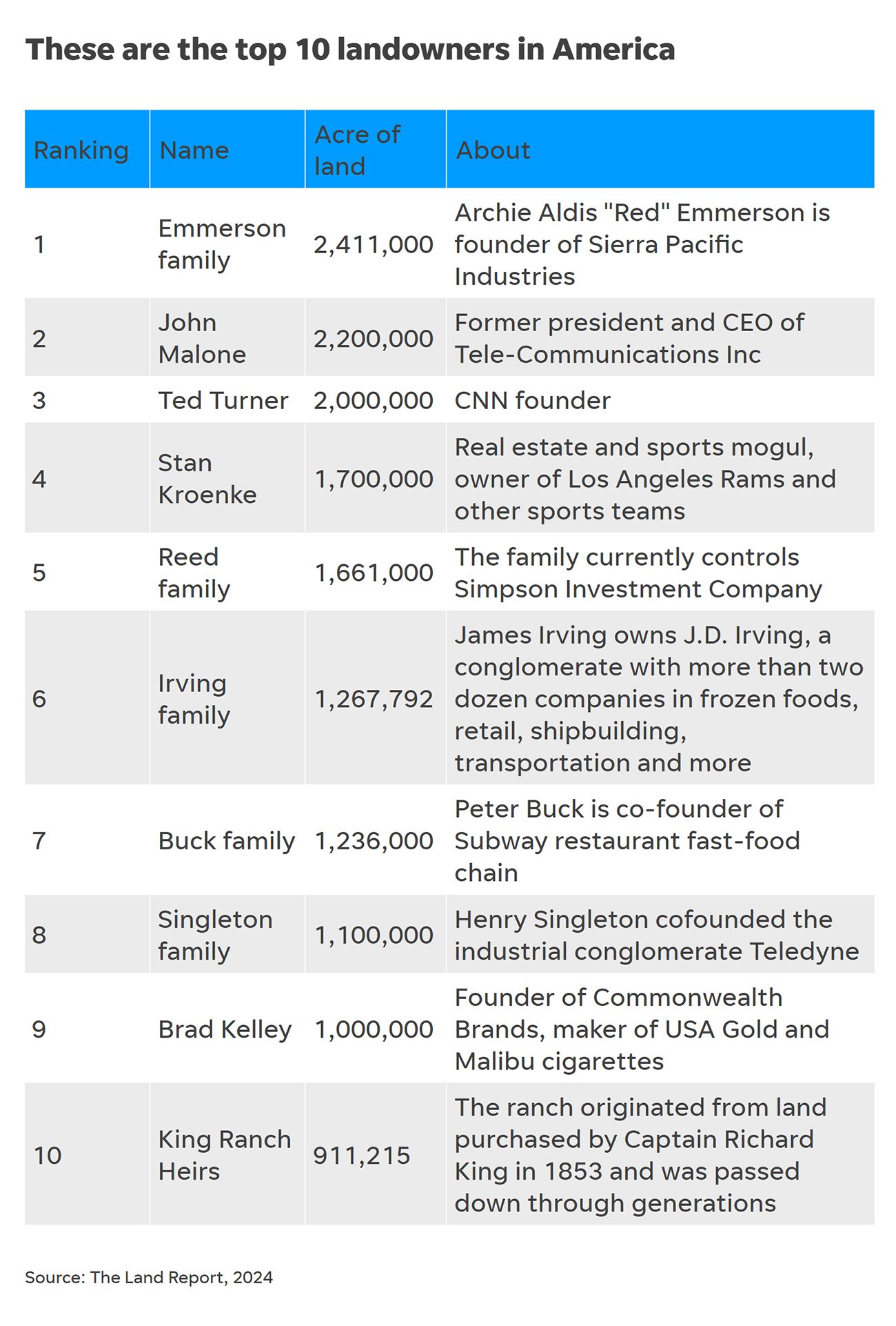 토지소유를 조사해 매년 ‘땅 부자’ 순위를 발표하고 있는 랜드리포트(Land Report)는 올해 미국의 ‘땅 부자’는 2,411,000에이커를 소유하고 있는 에머슨가(家)라고 소개했다.