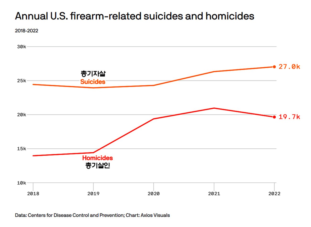 총기사건이 많이 발생하고 있지만 2022년의 총기자살은 총기살인 보다 더 많이 발생했다. 2022년 총기살인은 19,651건이었다.