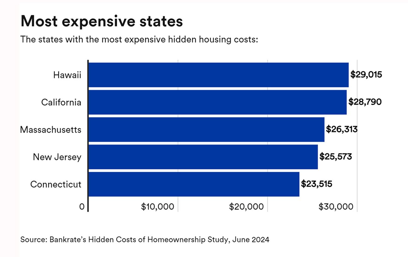 하와이에 이어서 주택유지비용이 높은 주는 캘리포니아($28,790), 매사추세츠($26,313), 뉴저지($25,573), 그리고 코네티컷($23,515) 순으로 나타났다.