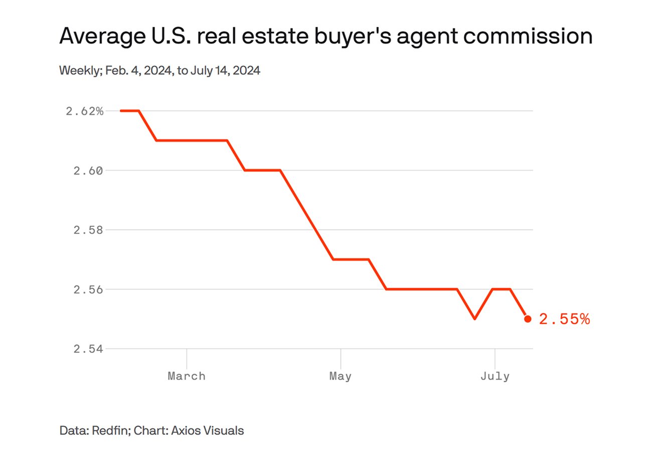 NAR가 패소했다는 소식이 전해지면서 ‘바이어’ 중개인 수수료가 계속 낮아지고 있다. 악시오스(Axios)는 8일 올해 2월 평균 2.62%였던 ‘바이어’ 수수료가 계속 떨어져 7월에는 2.55%까지 내려왔다고 전했다.