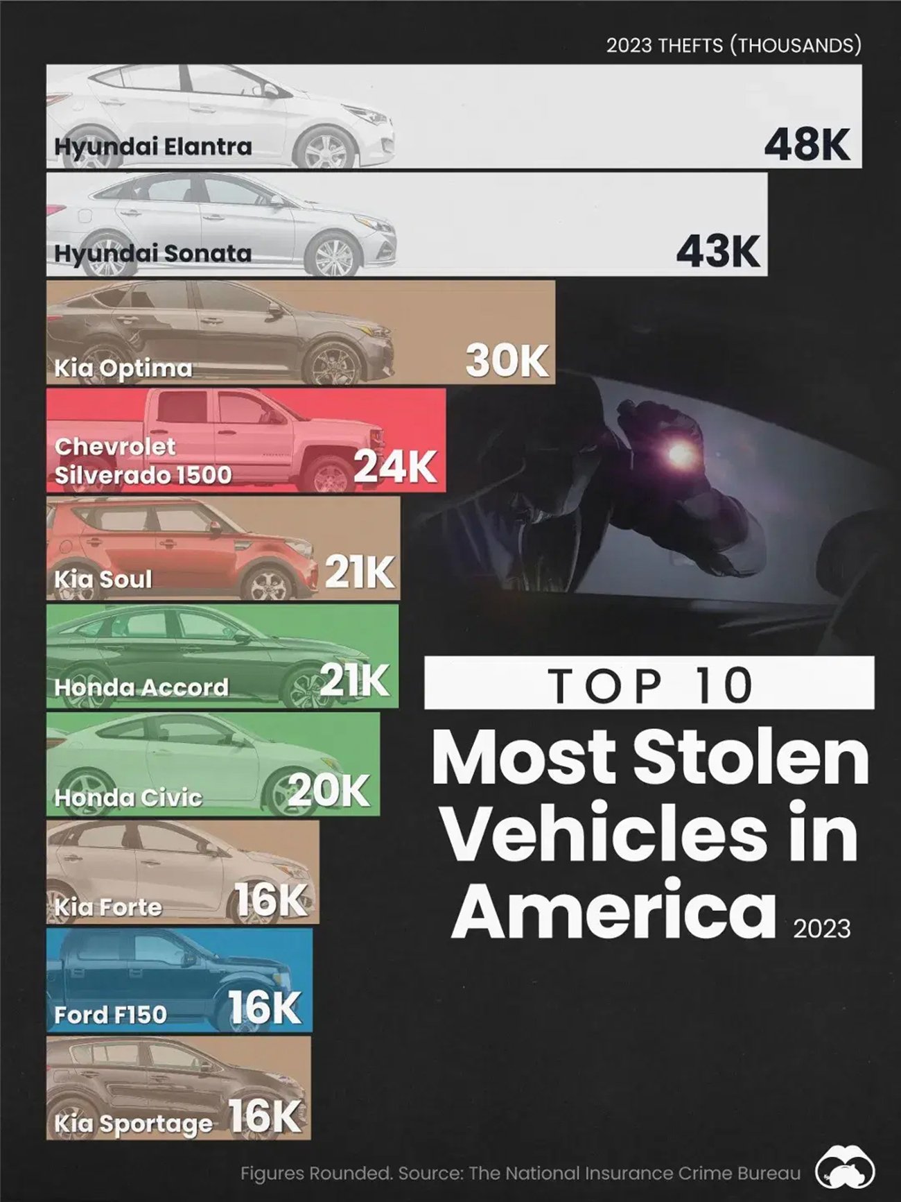 자동차 도난이 증가하고 있고, 가장 많이 도난당한 자동차는 한국산 자동차인 것으로나타났다. 마켓워치(MarketWatch)는 지난달 12일 보험법죄국(National Insurance Crime Bureau·NICB)의 자료를 분석해