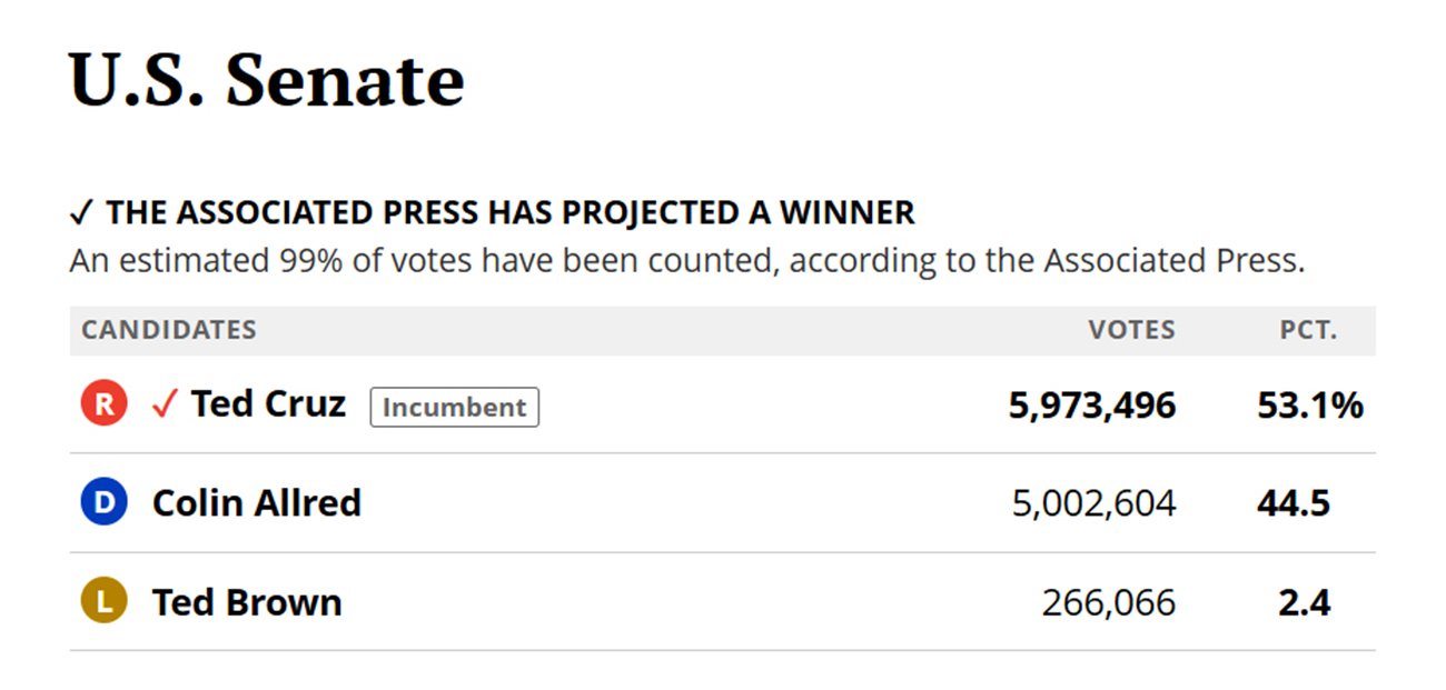 텍사스연방상원의원선거는 알레드 의원이 오차범위 내에서 앞서는 여론조사도 나오면서 민주당이 역대 최고액의 선거자금을 투입하며 세몰이에 나섰지만 크루즈 의원이 53.1%(5,973,496표)를 득표하면서, 44.5%(5,002,604표)의 득표율에 그친 알레드 의원을 8.6%p라는 압도적인 표차로 승리하면서 3선에 성공했다.