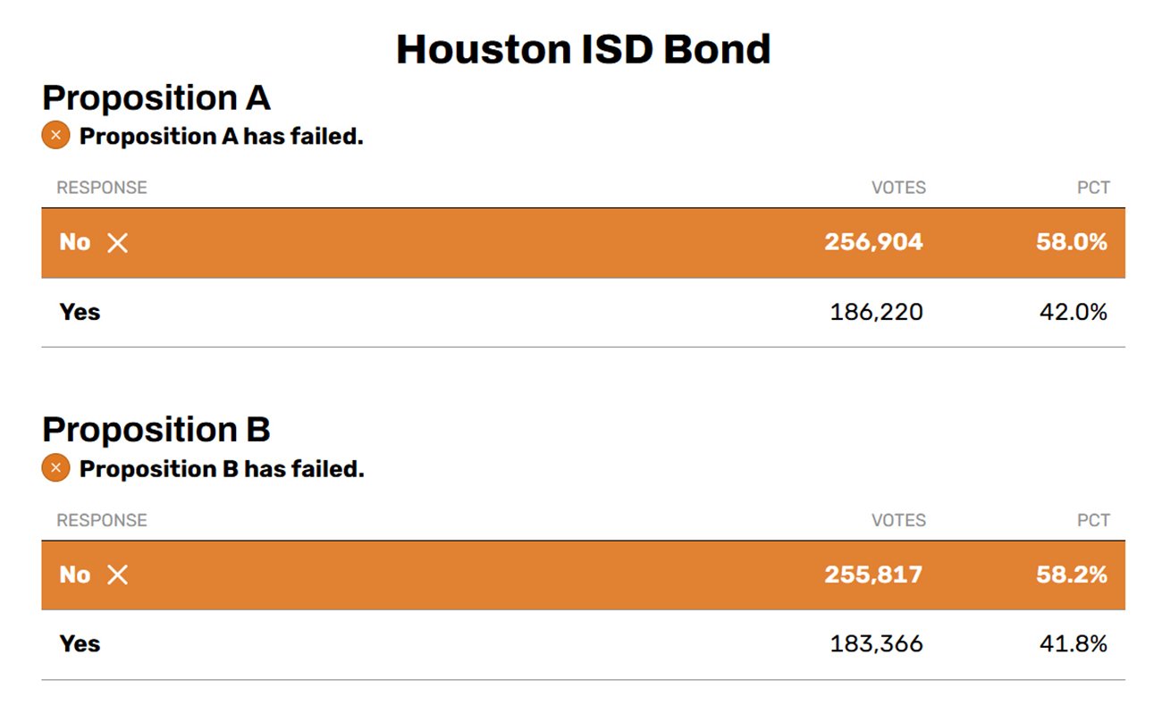 민주당 소속의 리나 히달고 해리스카운티저지가 빚을 내야 한다고 주장하면서 ‘배신자’라는 비판을 받는 등 논란이 계속되는 가운데 치러진 주민투표에서 44억달러 채권은 반대 58%, 찬성 42%로 부결됐다.