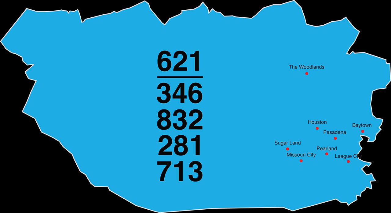 713, 281, 832, 그리고 346에 이어 621이 휴스턴 지역전화번호로 추가됐다. 휴스턴의 새로운 지역전화번호 621은 2025년 1월23일부터 사용된다. 휴스턴 첫 지역전화번호