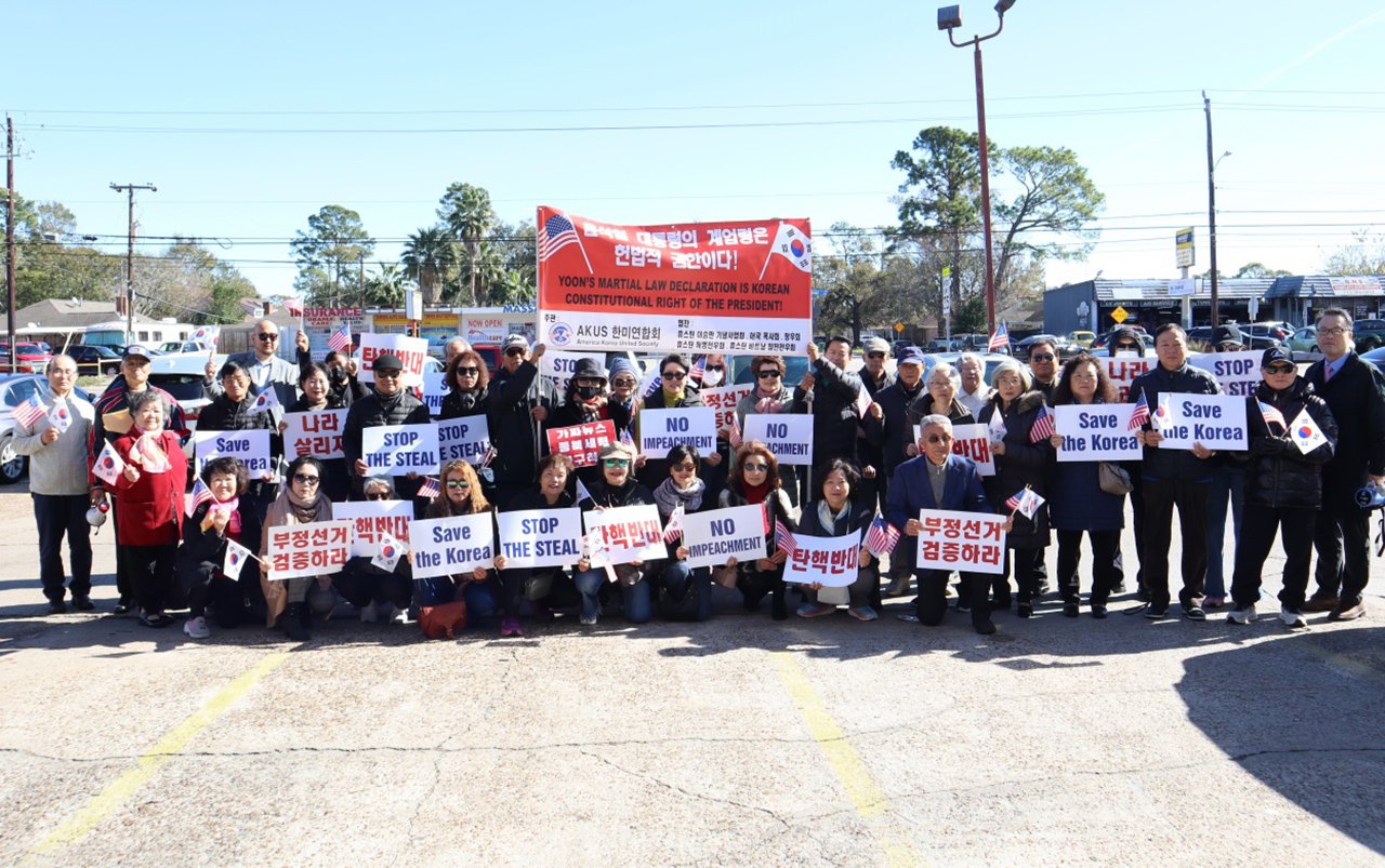 윤석열 체포·파면 촉구집회에 앞서 휴스턴 한미연합(AKUS)와 휴스턴이승만기념사업회, 해군동지회, 청우회, 휴스턴해병대전우회, 그리고 휴스턴베트남참전유공자회는 오전 11시 게스너 샤핑몰에서 “윤석열 대통령의 계엄령은 헙법적 권한이다”라는 현수막을 들고 집회를 가졌다.