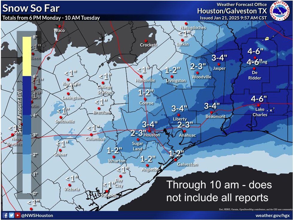 기상청에 따르면 하비공항에서는 3인치 가량의 눈이 내렸고, 베이타운에는 5.5인치까지 눈이 쌓였다.