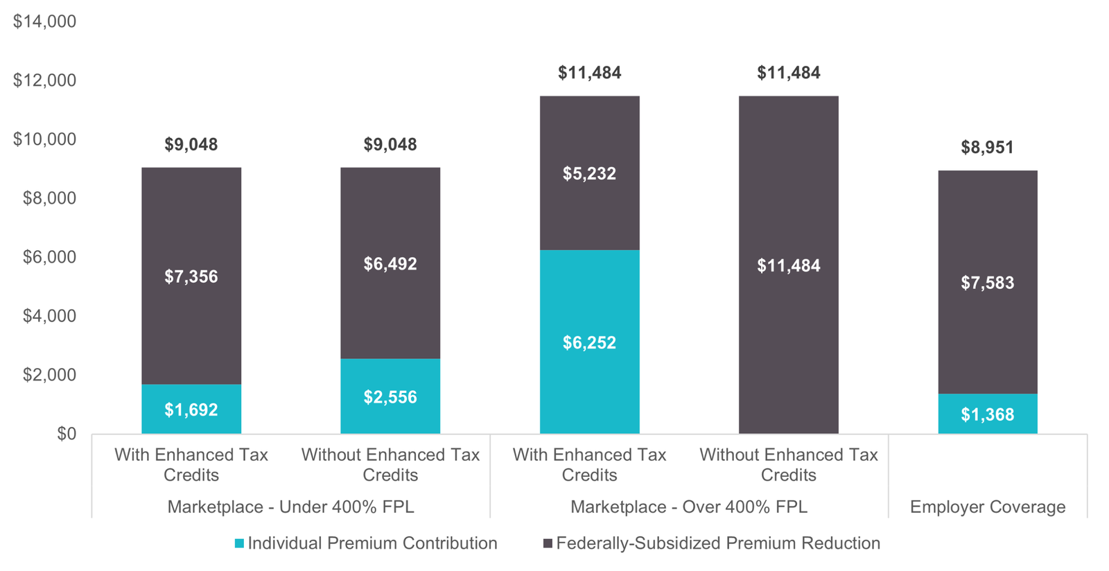 바이든 정부는 가능한 한 더 많은 사람들이 의료보험에 가입하도록 하기 위해 연방빈곤선(세제지원 기준)의 400%를 조금 넘는 소득자에게까지 세제지원을 확대했다. 이는 세제지원 수혜자격을 간신히 넘긴 계층이 세제지원 혜택을 못 받는 소위 ‘절벽현상’을 없애기 위한 조치였다.