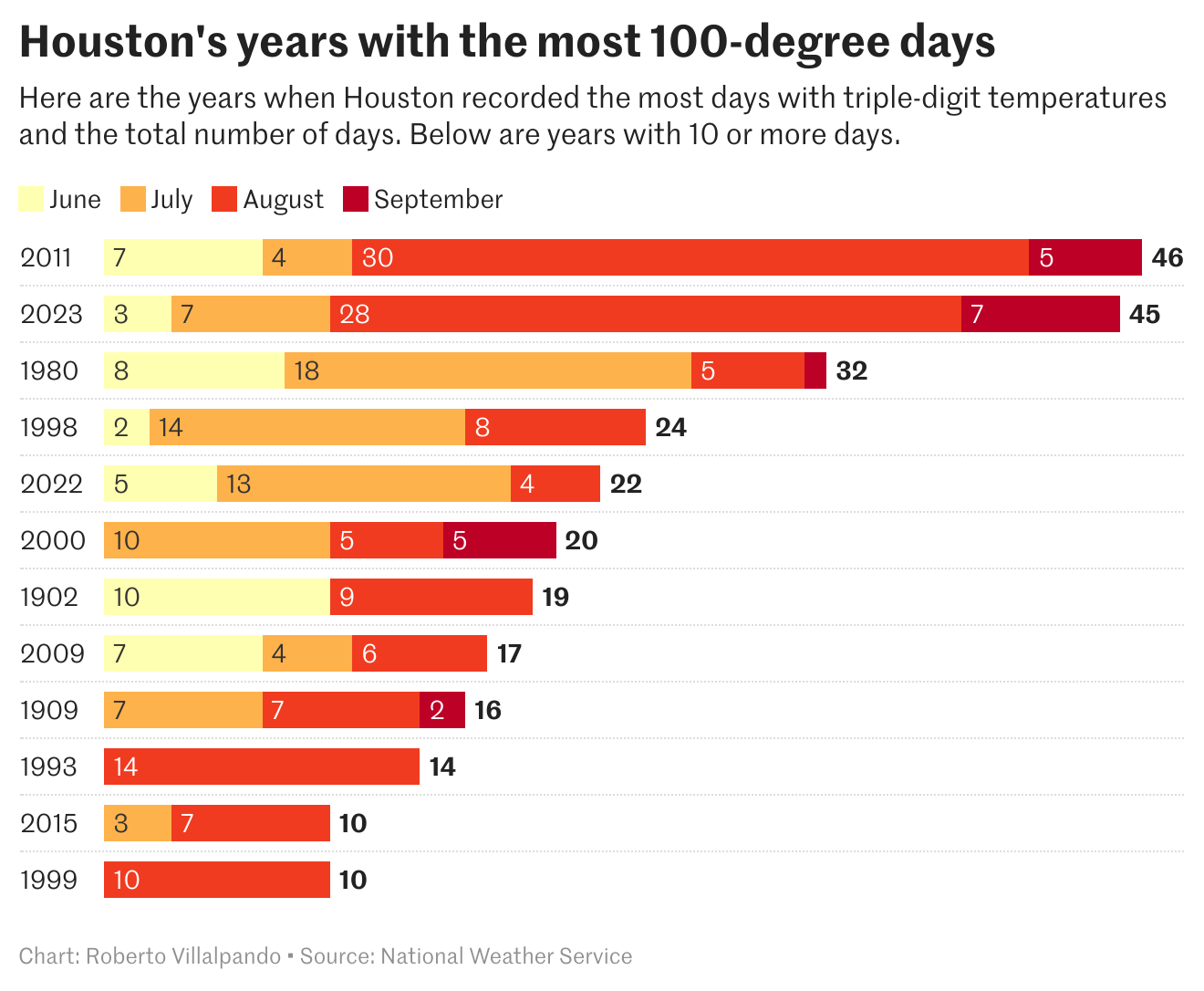 휴스턴은 평균적으로 7월19일, 100도의 날씨를 기록했다. 휴스턴에 100도의 날씨가 가장 빨리 찾아왔던 날은 6월2일로 2011년이었다, 2011년은 휴스턴에서 100도를 기록한 날이 가장 많았던 가장 무더운 해 중 하나였다.
