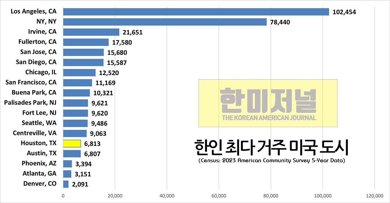 인구조사국의 ‘2023년 지역사회조사(ACS) 5년 추정치’에 따르면 LA에 거주하는 한인은 102,454명으로 그 어느 도시보다 많다.