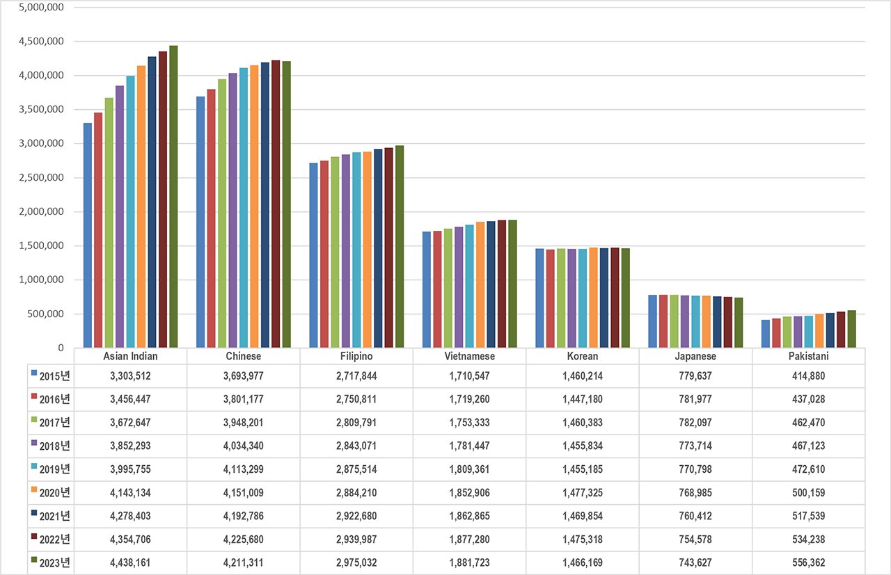 ‘생각하는 신문’ <한미저널>(The Korean American Journal)이 인구조사국(U.S, Census Bureau)의 ‘2023년 지역사회조사(ACS) 5년 추정치’ 자료를 바탕으로 각 도시에 ‘한인’들이 얼마나 많이 살고 있는지 소개해 오고 있다. 이번주 기사에서는 미국에 거주하는 아시아 각국의 이민자들이 2015년부터 2023년까지 얼마나 많이 증가했는지 소개한다.