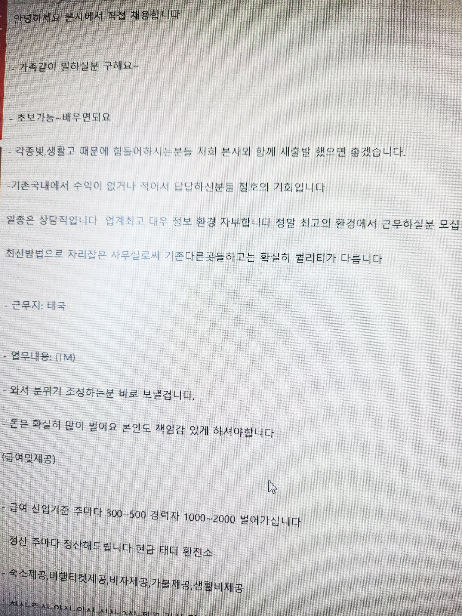 ‘K’ 휴스턴 한인 신문에 게재된 광고에는 “근무지 : 태국”이라며 “본사에서 직접 채용”하는 광고라고 강조하고 있다.