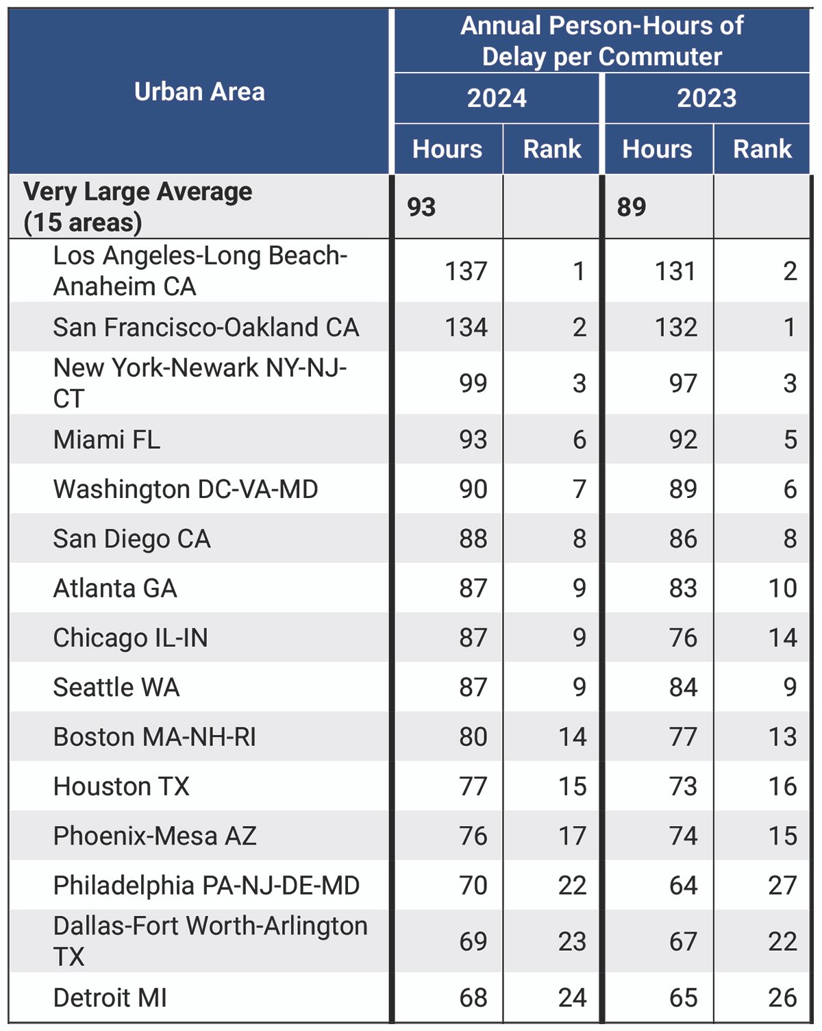 지난해 전국적으로 교통체증이 가장 심했던 도시는 LA로 통근자들이 1년 동안 도로에서 낭비한 시간은 137시간이었다. LA에 이어 샌프란시스코(134시간), 뉴욕(99시간), 마이애미(93시간), 그리고 워싱턴DC(90시간) 순으로 교통체증이 심한 것으로 나타났다.