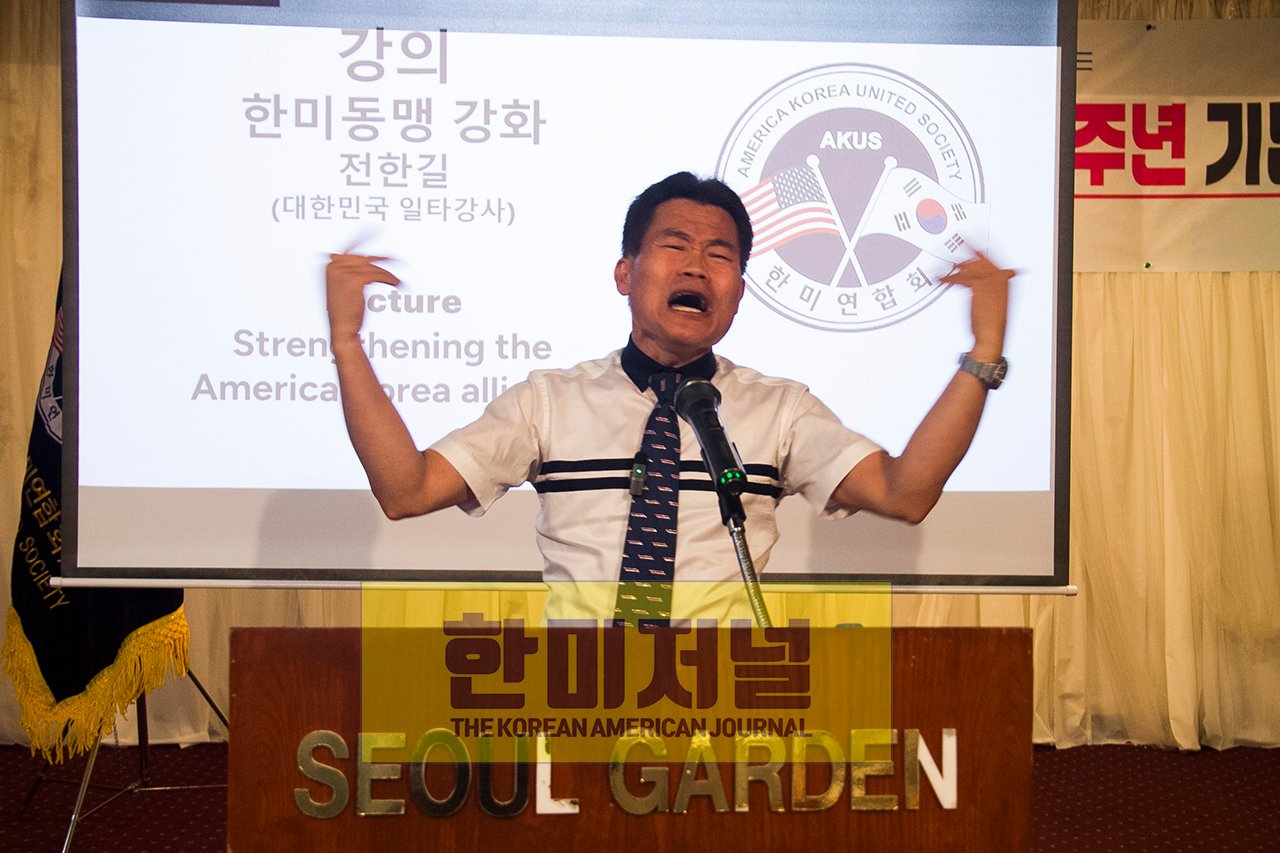 정수지 회장은 휴스턴AKUS 창립 2주년을 맞아 “대한민국의 인기스타 강사 전한길 선생님을 모셨다”며 “전한길을 세번 외쳐볼까요? 그래야 힘이 나시죠”라고