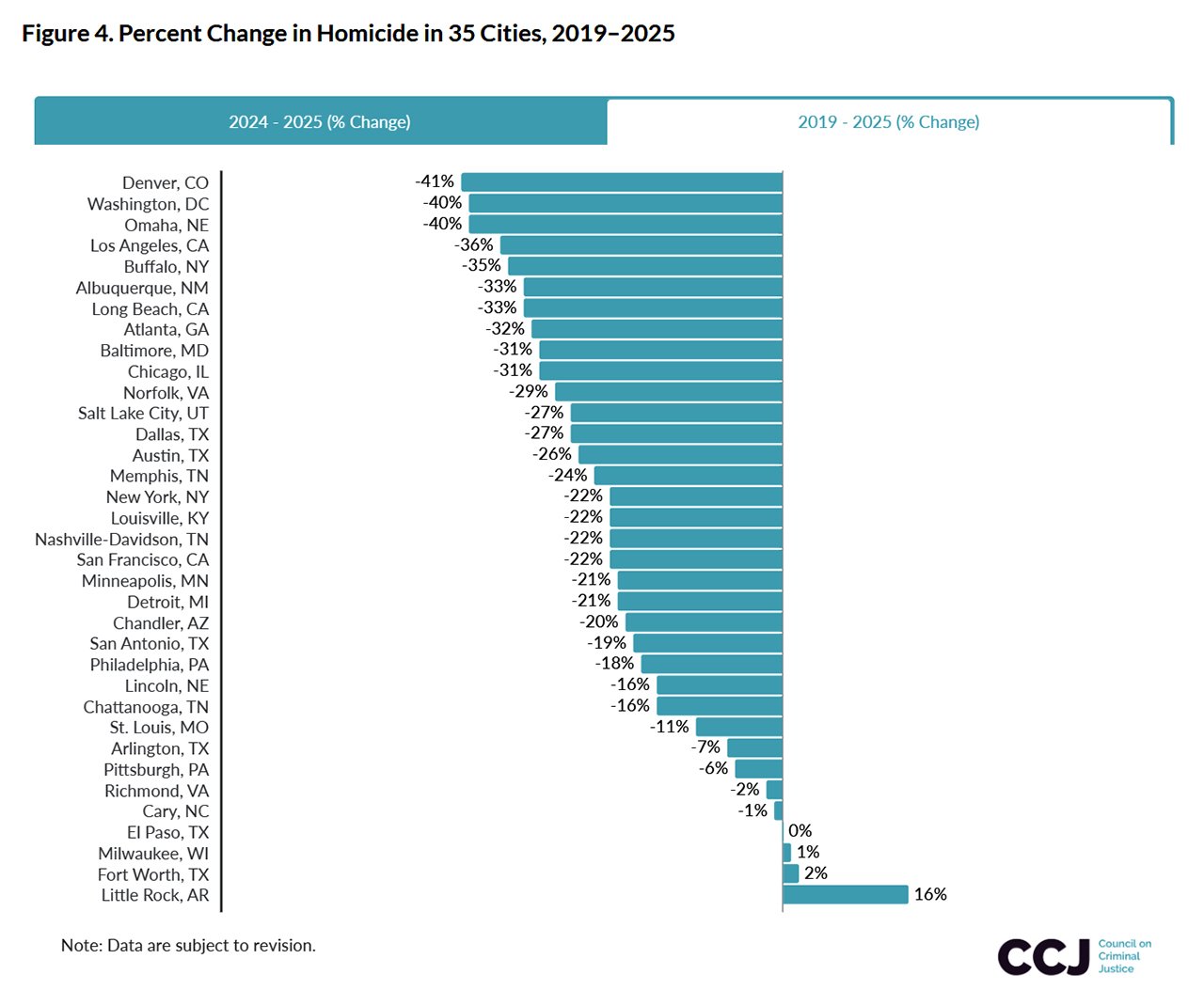 미국 내 범죄 및 사법정책을 연구하는 비정파 싱크탱크인 CCJ(Council on Criminal Justice)가 지난달 29일 발표한 보고서에 따르면 2025년 미국 35개 주요 도시의 살인율이 2024년보다 21% 감소했다.
