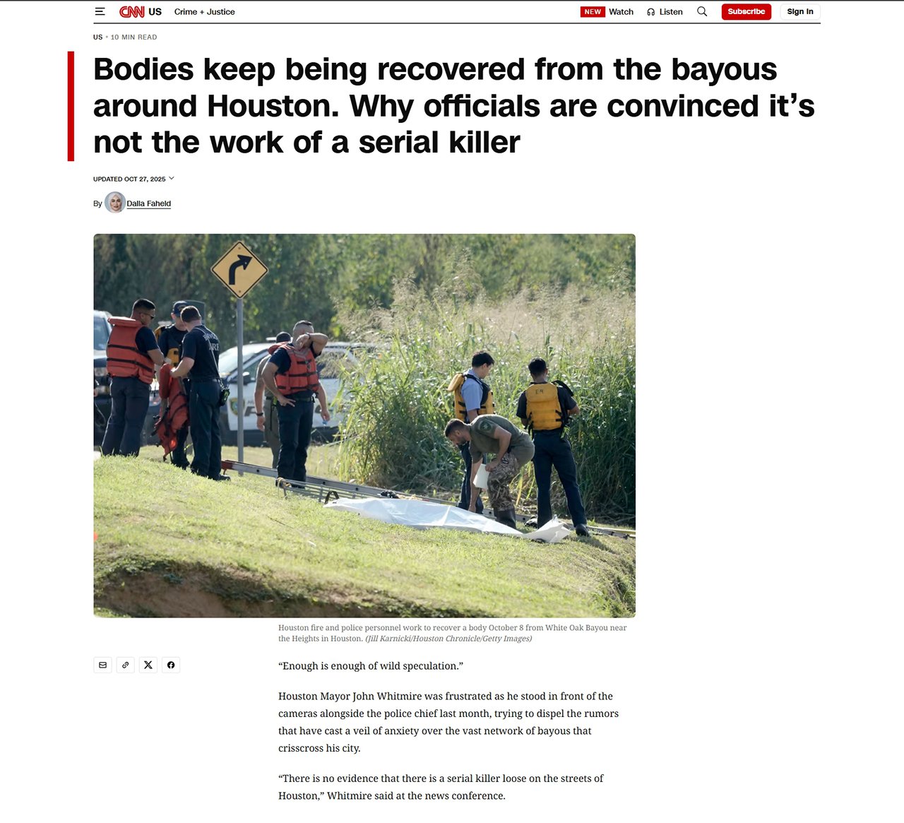휴스턴 바이유에서 사체가 연이어 발견되면서 대형 ‘연쇄살인’ 의혹까지 제기되자 CNN 등 주요 언론매체들도 다룰 정도로 휴스턴 바이유는 전국적인 이슈로 떠올랐다.