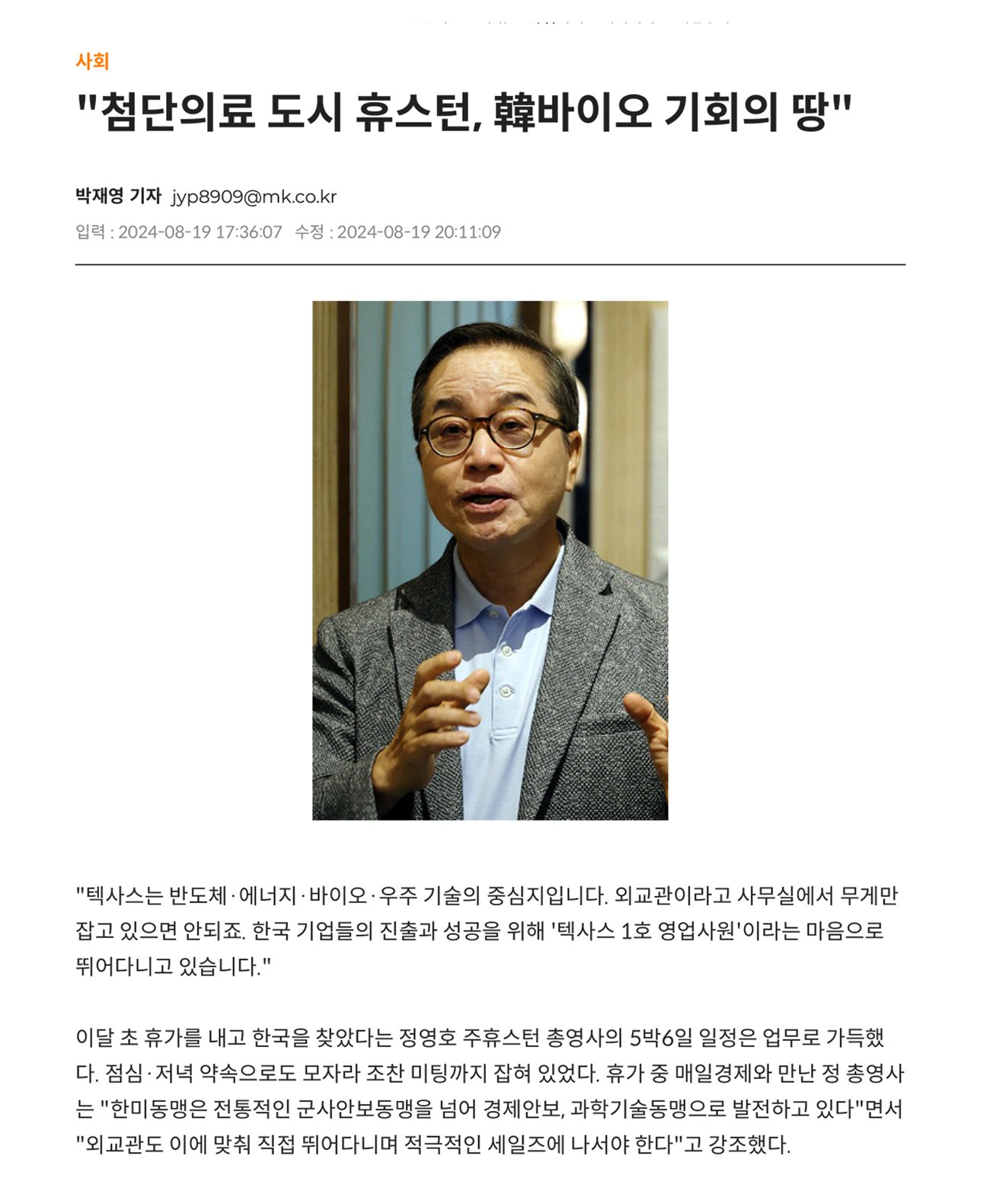 주휴스턴대한민국총영사관의 정영호 총영사의 인터뷰 기사가 한국 경제지 매일경제에 게재됐다. “첨단의료 도시 휴스턴, 韓바이오 기회의 땅”이란 제목으로 8월19일자에 게재된 기사에서 정