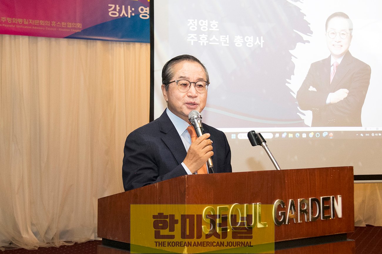 민주평화통일자문회의 휴스턴협의회(회장 박요한·이하 평통)가 18일(토) 서울가든에서 제23차 평화+통일 강연회를 개최했다. 평통의 이날 강연회는 주휴스턴대한민국총영사관의 정영호 총영사가 “윤석열 대통령의 ‘담대한 구상’과